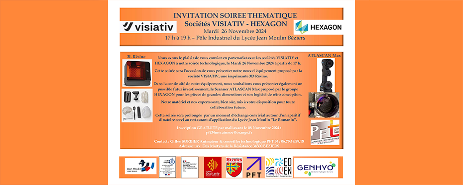 Dans le cadre de la Semaine de l’Industrie, le Lycée Jean MOULIN de Béziers et la PFT 34 MÉC@INNOV invitent les industriels de l’Hérault et des départements voisins, à une rencontre technologique le mardi 26 Novembre 2024 au Pôle industriel du Lycée Jean Moulin Béziers. [...]