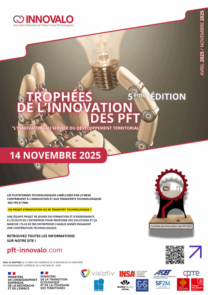 Aussi, l’association PFT Innovalo, avec le soutien de la Direction Générale de la Recherche et de l’Innovation du Ministère de l’Enseignement Supérieur, de la Recherche et de l’Innovation (DGRI), organise depuis 4 ans les Trophées de l’Innovation des PFT pour valoriser les multiples réalisations des plateformes technologiques (PFT).
